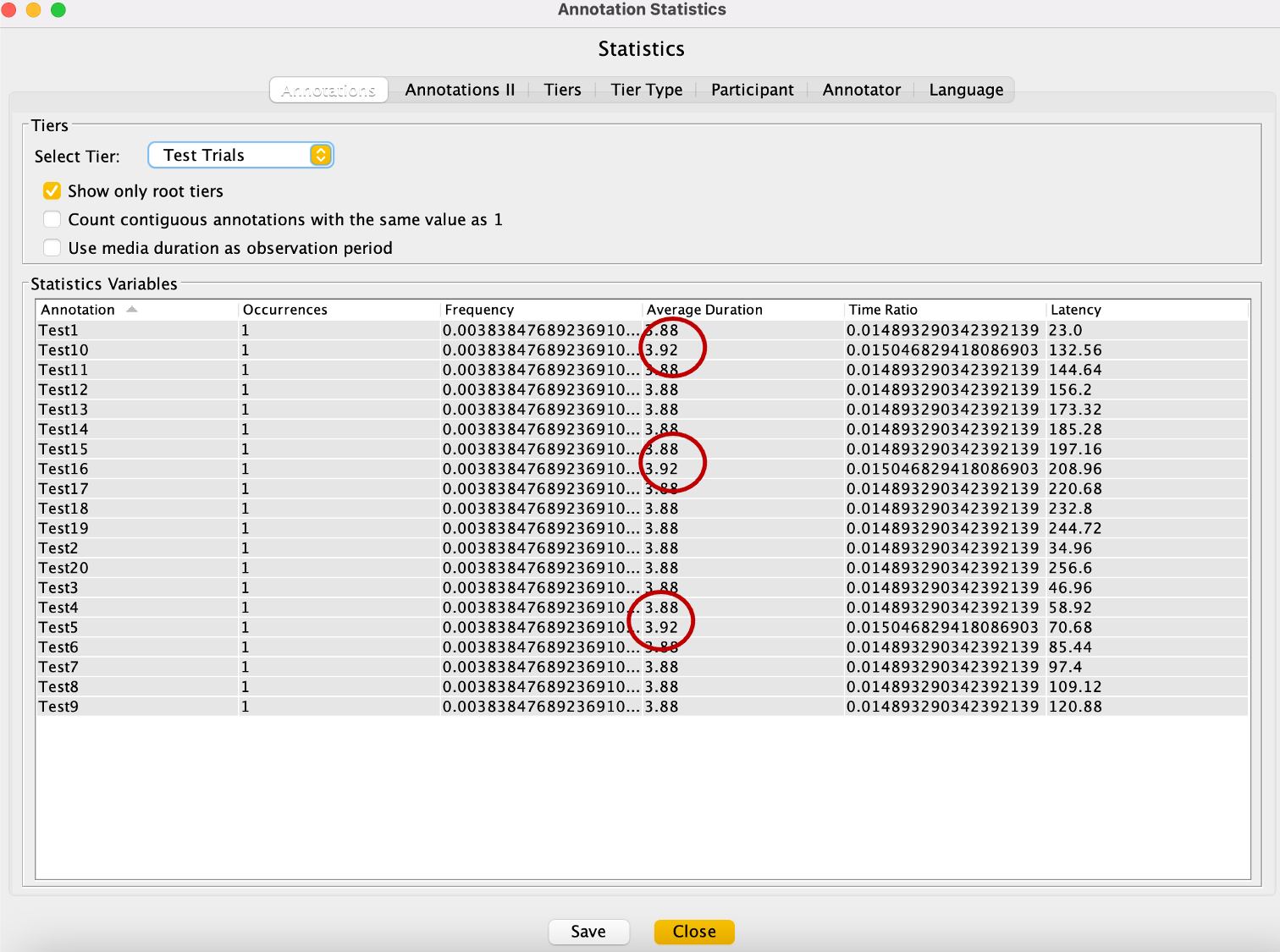 On the whole, this is working well. But when exporting my annotation statistics, there are a couple of issues. I’m not sure if these are problems because of my ELAN setup or due to a software glitch.