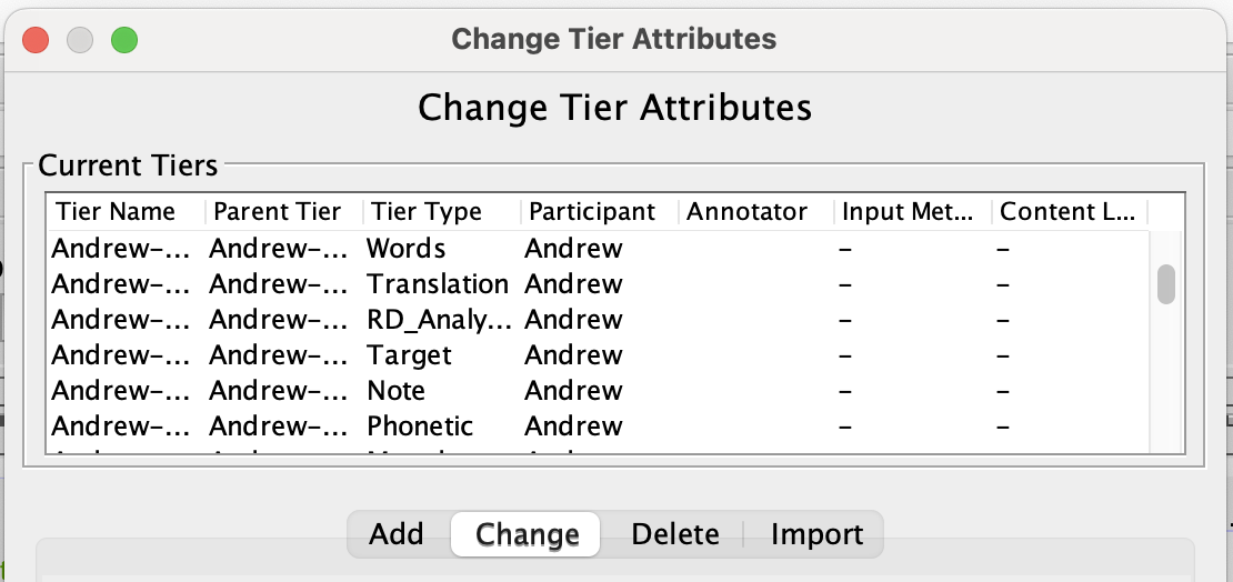 Unfortunately this table can’t be exported or copied (can only select one row at a time). When I try exporting the ELAN file to tab-delimited text, I can only get data on the tier name and participant, but not the associated tier type (even if I export tiers by tier type).